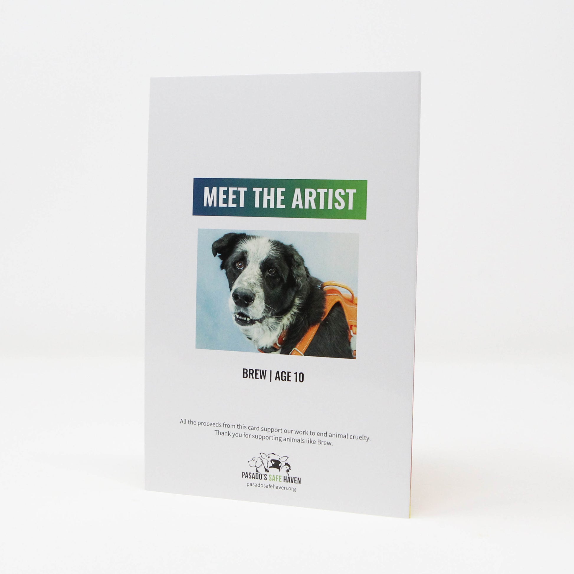 This collection of four greeting cards features the unique artwork from our sanctuary residents Brew, Lil Rascal, Raspberry, and Elvis. Cards are blank on the inside and each include an envelope.